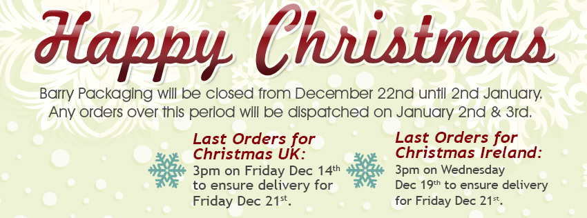 Barry Packaging will close at 1pm on Friday December 21st and will re-open on January 2nd. Any orders received during this period will be dispatched on January 2nd and 3rd.