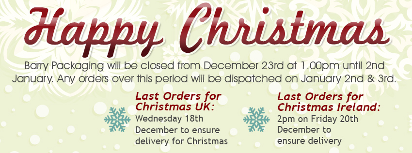 Barry Packaging will close at 1pm on Friday December 23rd and will re-open on Thursday January 2nd. Any orders received during this period will be dispatched on January 2nd and 3rd.