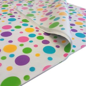 Multicoloured polka dot tissue paper would be a fantastic choice for your summer packaging. This bright tissue would gorgeously paired with one of our paper bags such as pink and purple.
